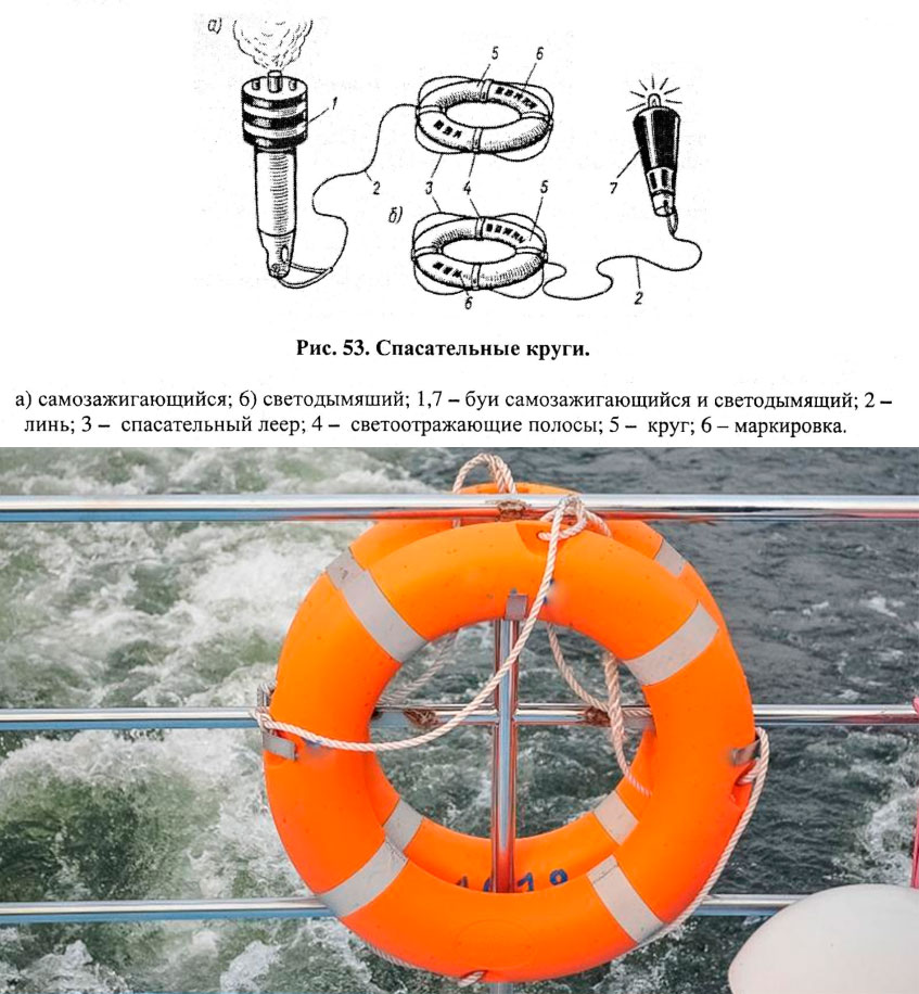 - половина спасательных кругов, но не менее шести, должны быть снабжены самозажигающимися огнями с источником питания, обеспечивающим продолжительность горения не менее 2 ч (рис. 53, а);
