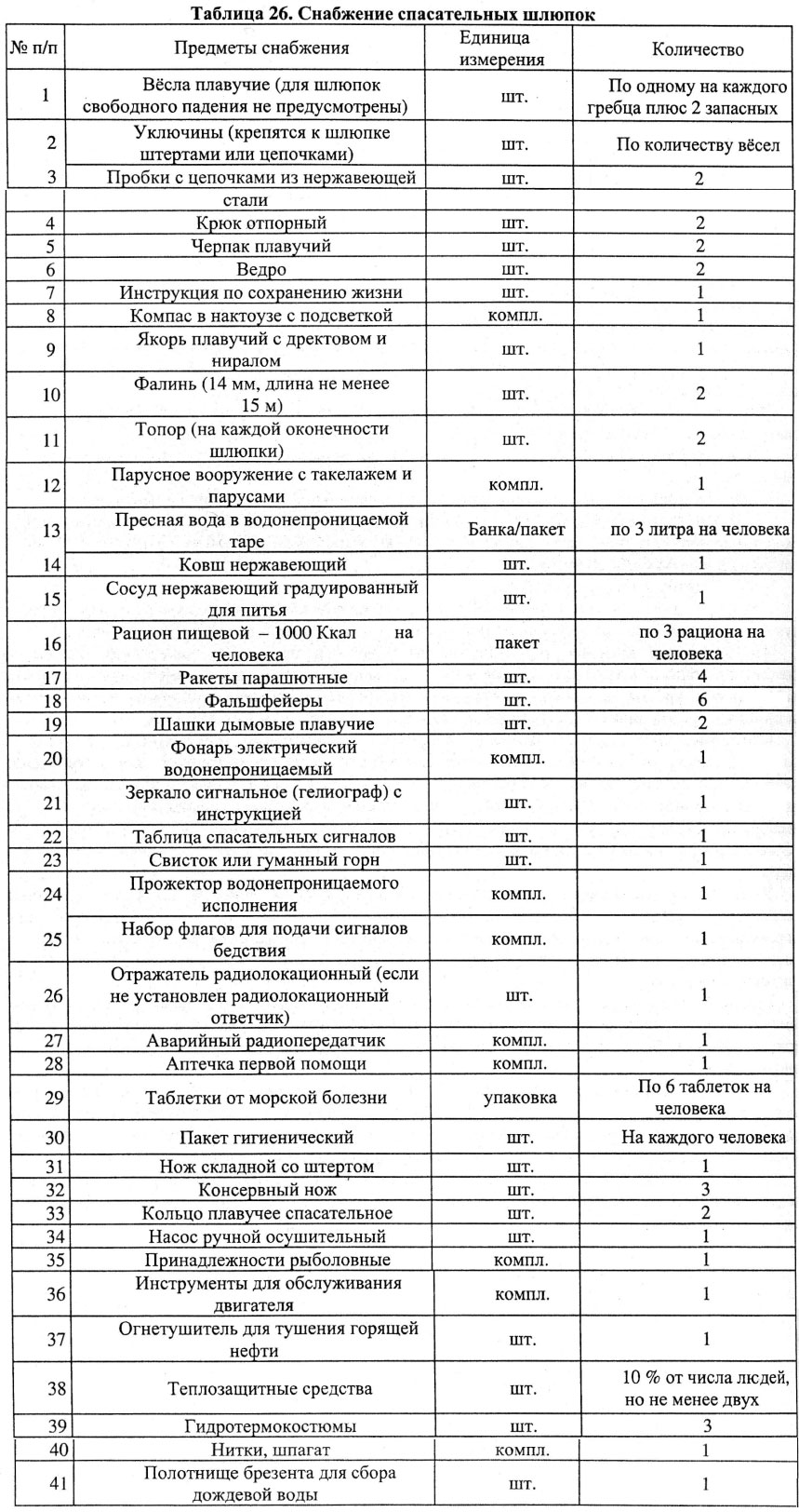 Объем требований по обеспечению и снабжению спасательными устройствами и средствами зависит от типа, назначения, размерений и района плавания судна.