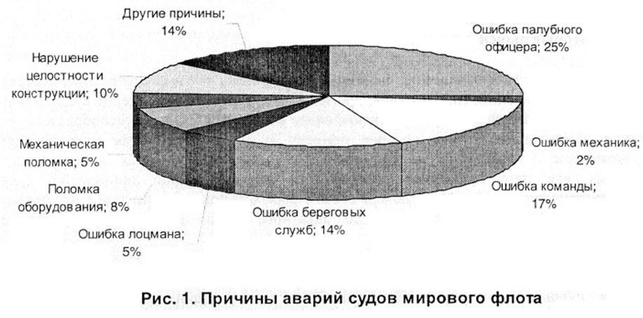 На рис. 1., по данным Регистра Ллойда, представлен анализ причин аварий морских судов мирового флота (данные 2002 года). Как мы видим, технические причины и нарушение целостности корпуса составляют 23% аварий, остальные аварии связаны с ошибками экипажа и береговых служб.