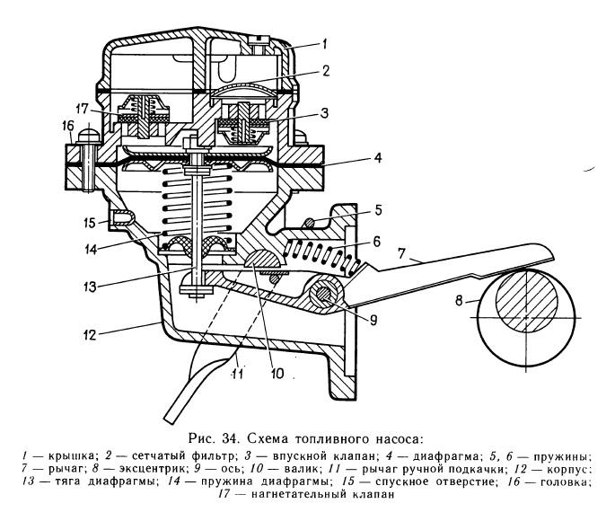 Топливный насос (рис. 34) диафрагменного типа служит для подачи топлива из бака в поплавковую камеру карбюратора. Насос состоит из корпуса, головки и крышки, отлитых из цинкового сплава. Между фланцами головки и корпуса зажата диафрагма, состоящая из четырех слоев хлопчатобумажной ткани, пропитанной топливомаслостойким лаком. Средняя часть диафрагмы закреплена на тяге. В головке насоса расположены нагнетательный клапан и два впускных клапана, изготовленные из топливомаслостойкой резины.