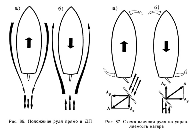 Действие руля. Главным органом управления судном является руль. Если при положении руля прямо в диаметральной плоскости судну дать полный передний (рис. 86, а) или задний ход (рис. 86, б) и выключить двигатель, то оно по инерции, при условии отсутствия ветра и волны, будет продолжать прямолинейное движение. В этом случае встречный поток воды равномерно обтекает корпус и оказывает на перо руля одинаковое давление с обеих сторон, не вызывая никаких других сил, способных отклонить в сторону нос или корму судна.