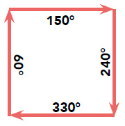 Следуя на 330 градусов на то же расстояние, что и по предыдущим сторонам, вы вернётесь в изначальную стартовую точку. Чтобы осуществить такое же движение, но против часовой стрелки, вы должны вычитать 90 градусов при каждом повороте:
