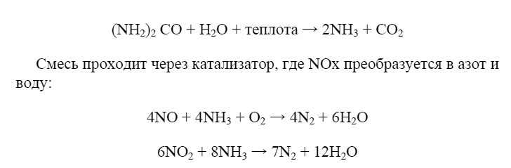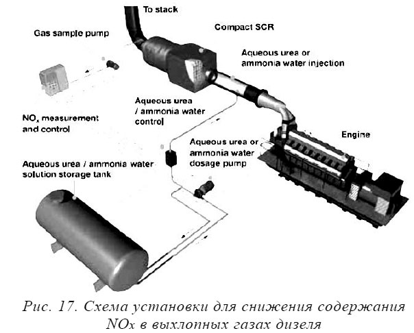 Дальнейшее снижение окислов азота на 85-95% может быть достигнуто путем дополнительной очистки выхлопных газов в селективном катализаторе (рис. 17), в котором используется 40% водный раствор безвредной субстанции UREA (мочевина), применяемой в сельском хозяйстве. Она впрыскивается непосредственно в выхлопные газы за ГТН, где соединения азота разлагаются на аммоний и углекислый газ по следующей формуле: