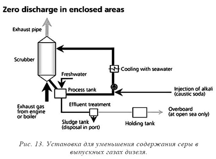 Содержание SO, находится в прямой зависимости от содержания серы в топливе, и самый простой путь ее снижения – сжигание в двигателях малосернистых топлив. Однако в настоящее время, когда существует тенденция к увеличению вязкости используемого топлива и, следовательно, содержания в нем серы, альтернативным средством существенного уменьшения содержания серы в выхлопных газах является применение системы водяного скруббинга, разработанной и внедряемой фирмой Wartsila.