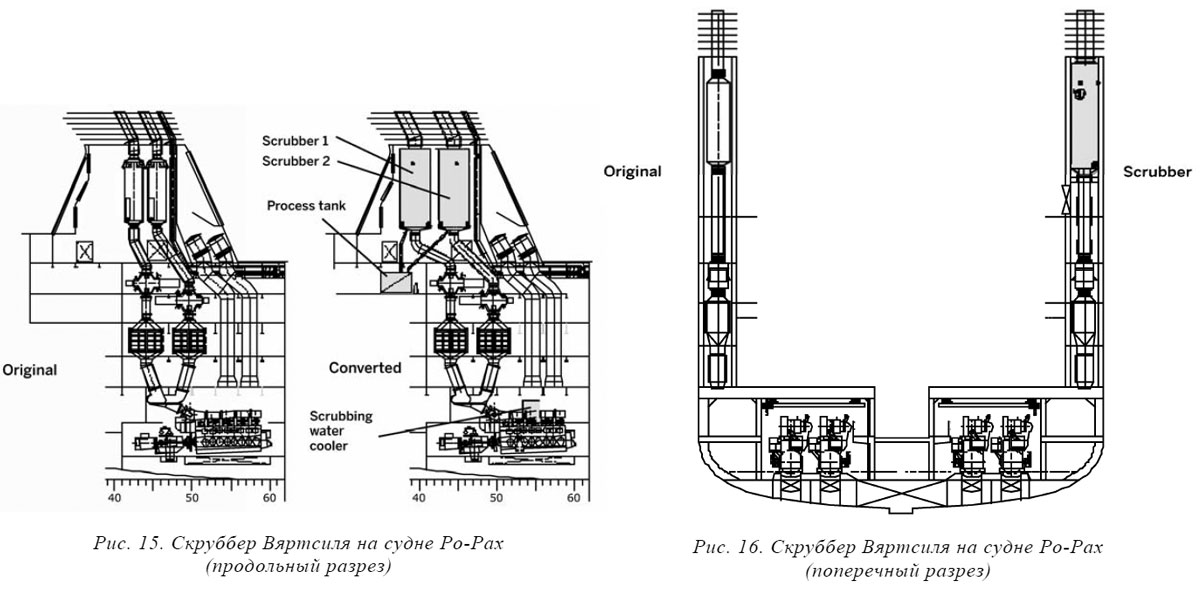 Такой скруббер устанавливается на газовыпускном тракте главного двигателя.(рис. 15. и рис. 16. Скрубберная установка на судне Ро-Рах).