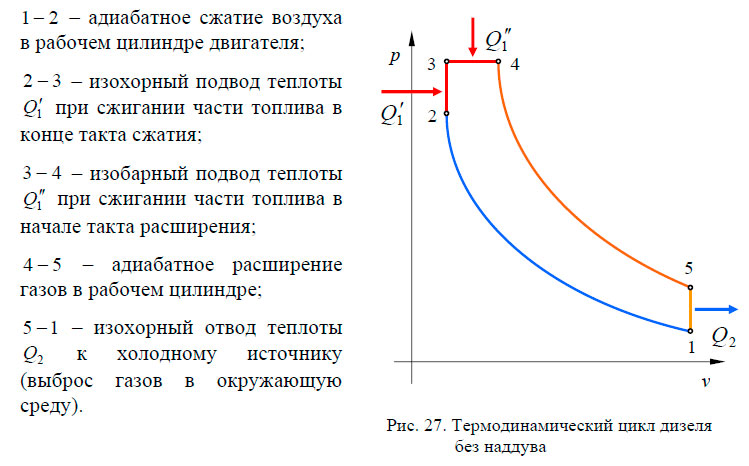 Рабочий цикл дизельного двигателя без наддува состоит из следующих термодинамических процессов (рис. 27):