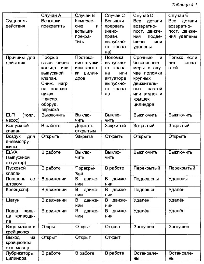 Действия: Отключить топливный насос. (См. описание МОР). Масло охлаждения поршня и вода, охлаждающая цилиндр, должны быть отключены, см. также п.4.