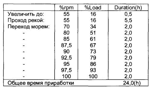 На практике двигатель, безусловно, должен работать во всём диапазоне маневрирования. Кроме того в ситуациях, когда двигатель должен работать с малой нагрузкой длительный период, например, при проходе узкостей, необходимо придерживаться программы приработки. Например, когда первая обкатка имеет место при длительном проходе реки/канала, можно выбрать следующую программу, см. также рис. 7.8: