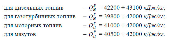 Удельная низшая теплота сгорания применяемых топлив для судовых дизельных установок составляет: