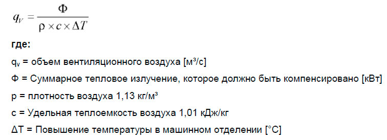 Объем воздуха для вентиляции машинного отделения (необходимо помнить, что должны быть выполнены упомянутые выше требования - 30 оборотов объема воздуха/час) рассчитывается по формуле:
