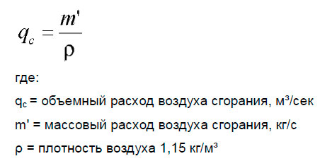 Воздух сгорания должен подаваться отдельными нагнетателями, мощность которых должна быть несколько больше, чем максимальный расход воздуха. Масса воздуха сгорания, указанная в технических данных, определена для температуры окружающего воздуха 25°С. Для определения плотности воздуха, соответствующей 30°С или более следует перевести массовый расход в объемный расход. Для вычисления объемного расхода можно пользоваться следующей формулой: