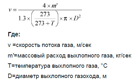 Рекомендованная скорость потока в газоходе 35…40 м/сек при максимальной производительности. В случае, если в газоходе имеются места, увеличивающие противодавление или газоход очень длинный, скорость потока газа должна быть ниже. Массовый расход выхлопного газа, приведенный в разделе «Технические данные», можно пересчитать в скорость потока с использованием формулы: