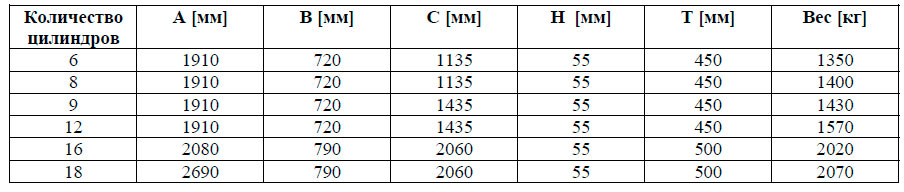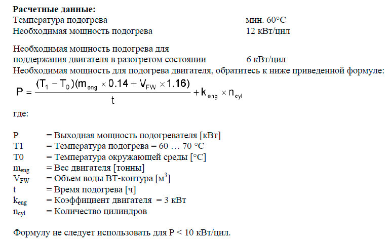 Минимальная необходимая мощность нагрева, позволяющая разогреть двигатель от 20 ºC до 60 … 70 ºC за 10 –15 часов, составляет 12 кВт/цил. Мощность нагрева, необходимая для более быстрого прогревания, может быть рассчитана по нижеприведенной формуле. Для поддержания двигателя в разогретом состоянии требуется приблизительно 6 кВт/цил.