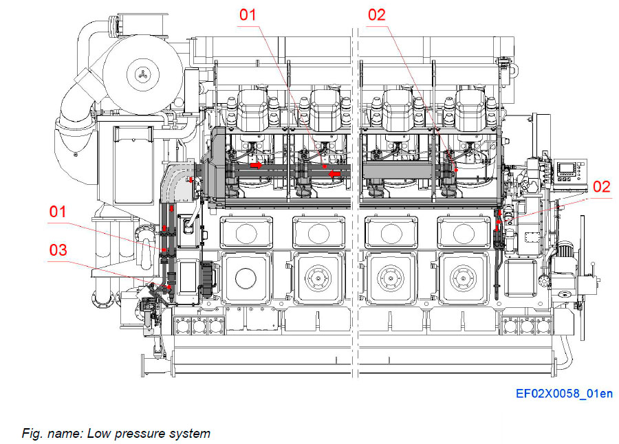 - 02 Pilot fuel common rail piping, (A- and B-sides)