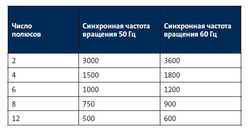 Синхронная частота вращения уменьшается с увеличением числа полюсов. В таблице, приведенной ниже, показана синхронная частота вращения для различного количества полюсов.