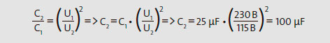 Таким образом, в электродвигателе, рассчитанном на питание от сети в 230 В, используется конденсатор 25 µФ/400 В, для модели электродвигателя на 115 В необходим конденсатор ёмкостью 100 µФ с маркировкой более низкого напряжения — например 200 В.