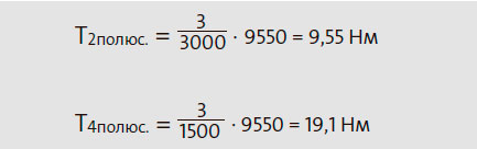 Например, предположим, что у нас 2-полюсный электродвигатель (с частотой вращения 3000 мин-1) и 4-полюсной электродвигатель (с частотой вращения 1500 мин-1). Мощность обоих электродвигателей 3,0 кВт, но их вращающие моменты отличаются.
