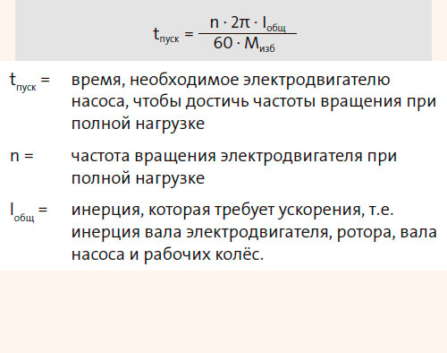 Нередко для сложных систем защиты и контроля электродвигателей требуется некоторое время для их пуска, чтобы они могли замерить пусковой ток электродвигателя. Время пуска электродвигателя и насоса рассчитывается с помощью следующей формулы: