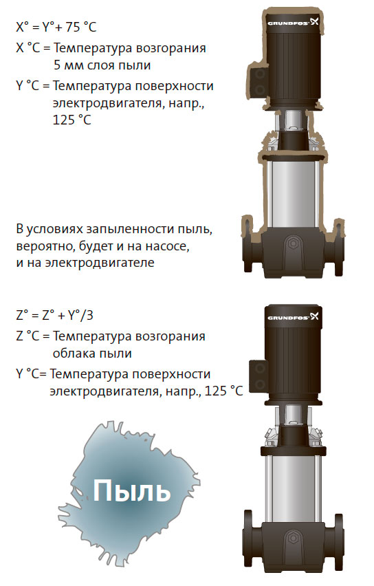 - Температура воспламенения облака пыли должна быть минимум на 1/3 выше указанной температуры электродвигателя.