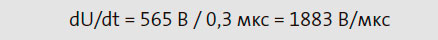 Изменение выходного напряжения в единицу времени можно охарактеризовать как ΔU/ Δt, или математически: значение dU/ dt стремится к бесконечности. Цифра в правой части достигает бесконечности dU/dt. В реальных условиях этого не происходит. Требуется некоторое время, чтобы перевести полупроводниковые контакторы инвертора из непроводящего режима в проводящий режим. В реальном переключении, мы предполагаем, что предел dU/dt достигнет определённого значения.