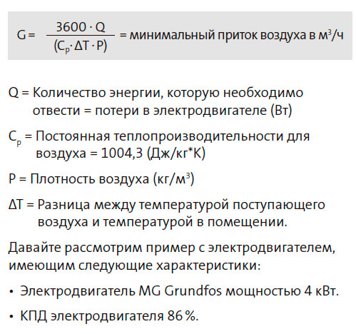 Для расчета требующегося притока воздуха в помещение, где установлены электродвигатель и насос, используется следующая формула: