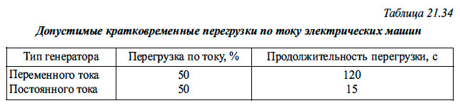 После нагревания до установившейся температуры, соответствующей номинальной нагрузке, генераторы должны выдерживать перегрузки по току, указанные в табл. 21.34.