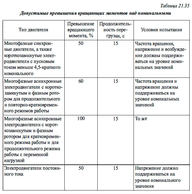 Электродвигатели должны развивать без остановки или внезапного изменения частоты вращения моменты, увеличенные с учетом превышений, указанных в табл. 21.35.