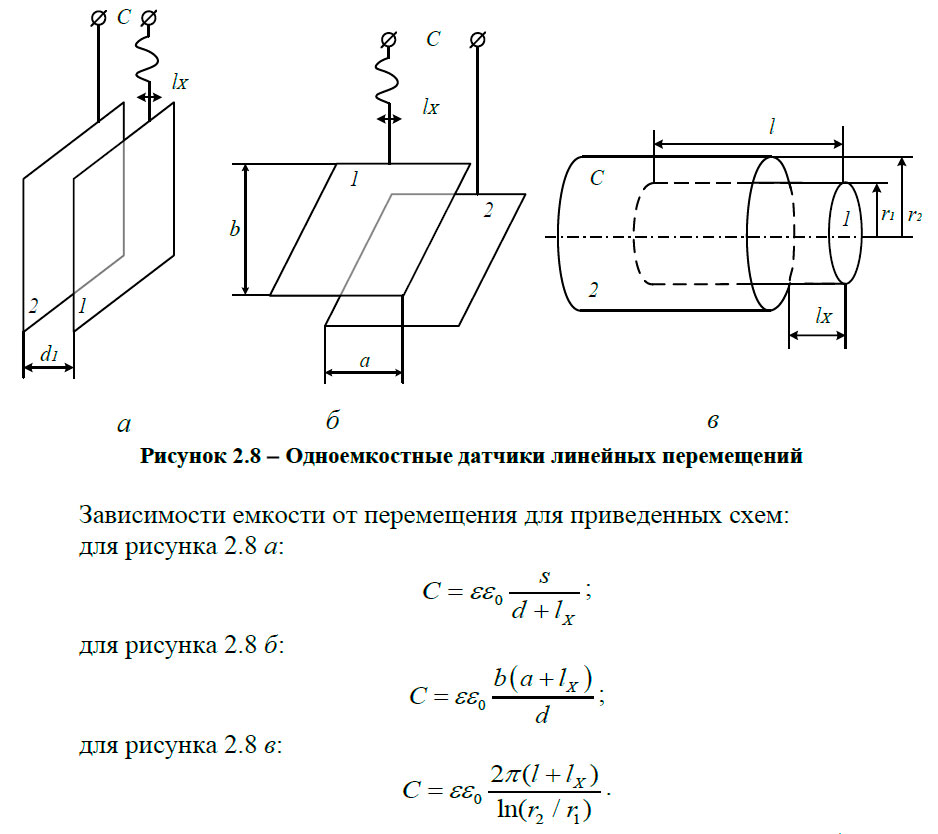 Емкостной датчик представляет собой одну или несколько емкостей с изменяющимися параметрами. При движении контролируемого объекта его емкость может изменяться путем: