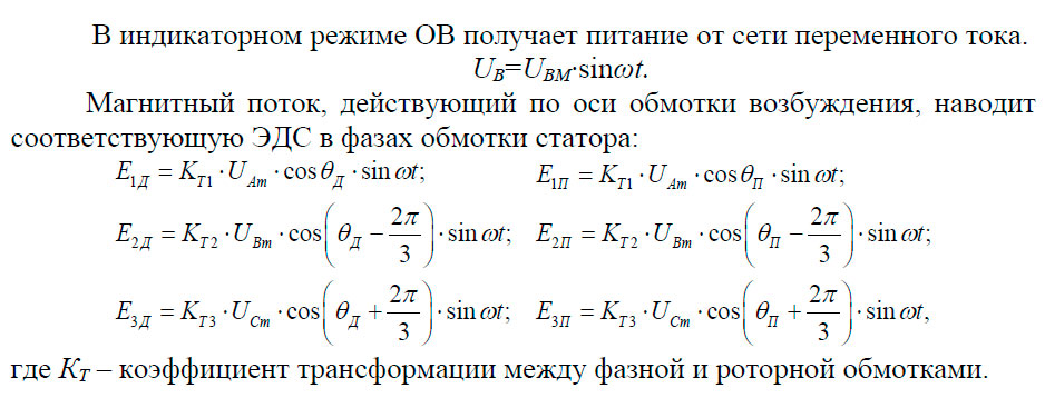 Обмотка возбуждения сельсина-датчика, как и в случае индикаторного режима, подключена к питающей сети и служит для создания в магнитной системе машины пульсирующего магнитного потока. Обмотки синхронизации датчика и приемника соединены между собой линия связи. Обмотка возбуждения сельсина-приемника предназначена для выработки сигнала (напряжения), зависящего от угла рассогласования. В исходном положении ротора СД ось обмотки 1 совпадает с осью обмотки возбуждения ОВ, в которой наводится максимальная э.д.с. При повороте ротора СД обмотки 1,2 и 3 смещаются. Эти токи создают в сельсине–приемнике магнитный поток, направленный под углом Δα=αД–αП к продольной оси выходной однофазной обмотки. В выходной обмотке наводится ЭДС, которая является выходным сигналом сельсинной пары: