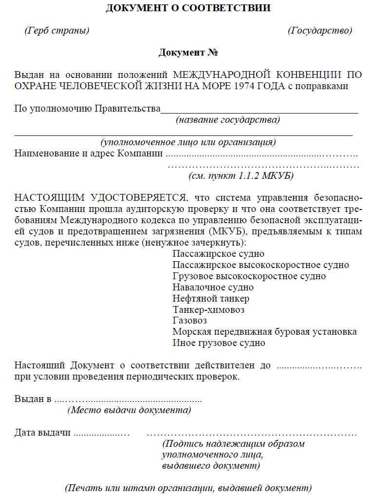 Документ о соответствии выдается Администрацией; организацией, признанной Администрацией; или, по просьбе Администрации, другим Договаривающимся правительством Конвенции любой Компании, отвечающей требованиям данного Кодекса, на время, оговоренное Администрацией, но не превышающее пяти лет. Такой документ принимается как доказательство того, что Компания способна выполнять требования данного Кодекса.