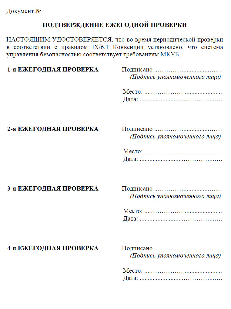 Действительность Документа о соответствии подлежит ежегодной проверке Администрацией; или организацией, признанной Администрацией; или, по просьбе Администрации, другим Договаривающимся правительством в течение трех месяцев до или после ежегодных дат.