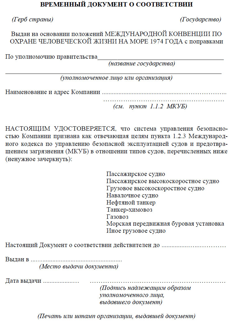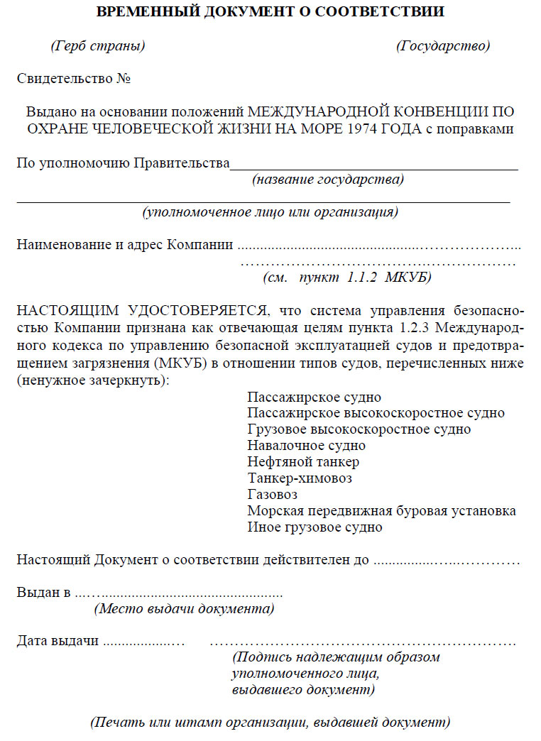 - новые типы судов подлежат добавлению к существующему Документу о соответствии, после проверки того, что Компания имеет систему управления безопасностью, которая отвечает целям пункта 1.2.3 данного Кодекса, при условии, что Компания предъявила планы внедрения системы управления безопасностью, отвечающей всем требованиям данного Кодекса в период действительности Временного документа о соответствии. Такой Временный Документ о соответствии выдается на срок, не превышающий 12 месяцев Администрацией или организацией, признанной Администрацией, или, по просьбе Администрации, другим Договаривающимся правительством. Экземпляр копии Временного Документа о соответствии должен находиться на судне, чтобы капитан, по требованию мог предъявить его для проверки Администрацией или организацией, признанной Администрацией, или для целей контроля, упомянутого в правиле IX/6.2 Конвенции. Экземпляр документа может не быть аутентичным или заверенным.