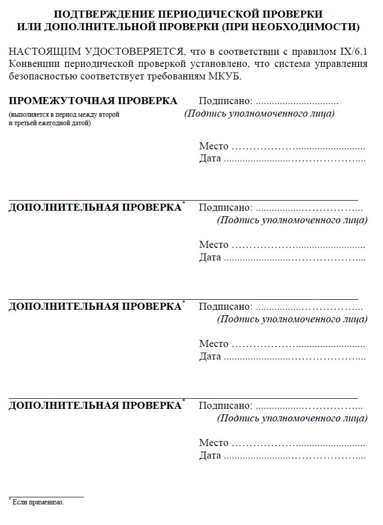 Действительность Свидетельства об управлении безопасностью подлежит, по меньшей мере, одной промежуточной проверке Администрацией или организацией, признанной Администрацией, или, по требованию Администрации, другим Договаривающимся правительством. Если предусматривается только одна промежуточная проверка, а период действительности свидетельства об управлении безопасностью составляет пять лет, она проводится между второй и третьей ежегодной датой Свидетельства об управлении безопасностью.