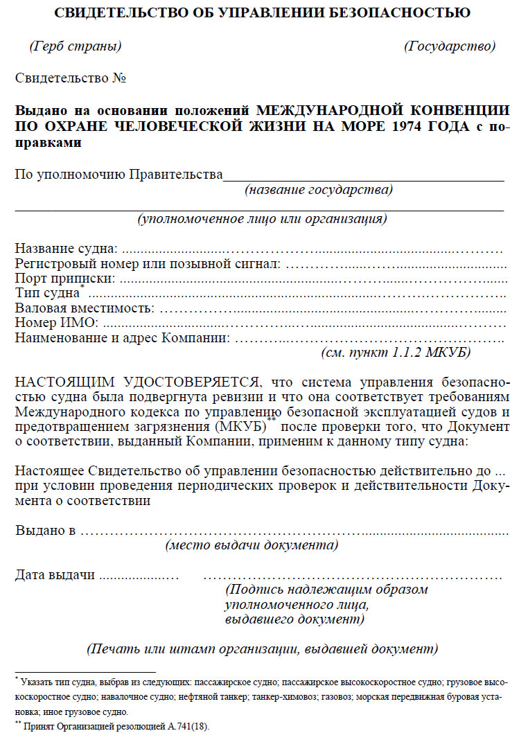 Свидетельство об управлении безопасностью выдается судну на время, не превышающее пяти лет Администрацией; или организацией, признанной Администрацией; или, по просьбе Администрации, - другим Договаривающимся правительством. Свидетельство об управлении безопасностью выдается после проверки того, что Компания и ее управленческий персонал на судне действуют в соответствии с одобренной СУБ. Такое свидетельство принимается как доказательство того, что судно отвечает требованиям данного Кодекса.