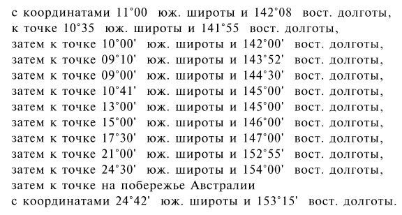 Ближайший берег. Выражение «от ближайшего берега» означает от исходной линии, от которой, согласно международному праву, отсчитываются территориальные воды соответствующей территории, за исключением того, что для целей настоящего Приложения выражение «от ближайшего берега» у северо-восточного побережья Австралии следует понимать как от линии, проведенной от точки на побережье Австралии.