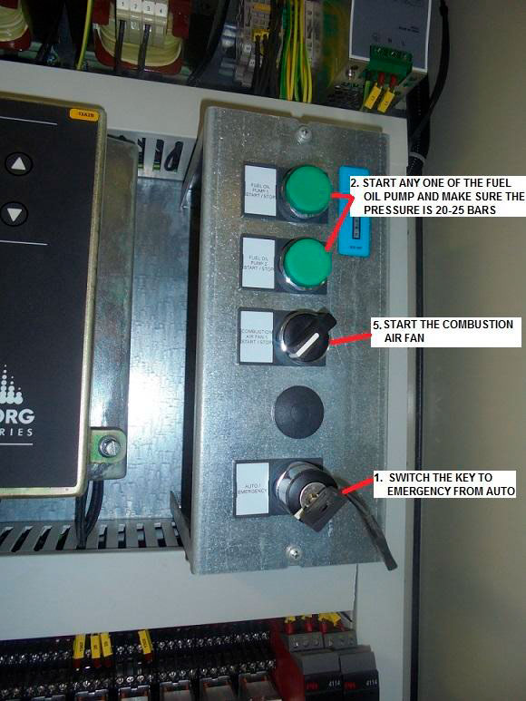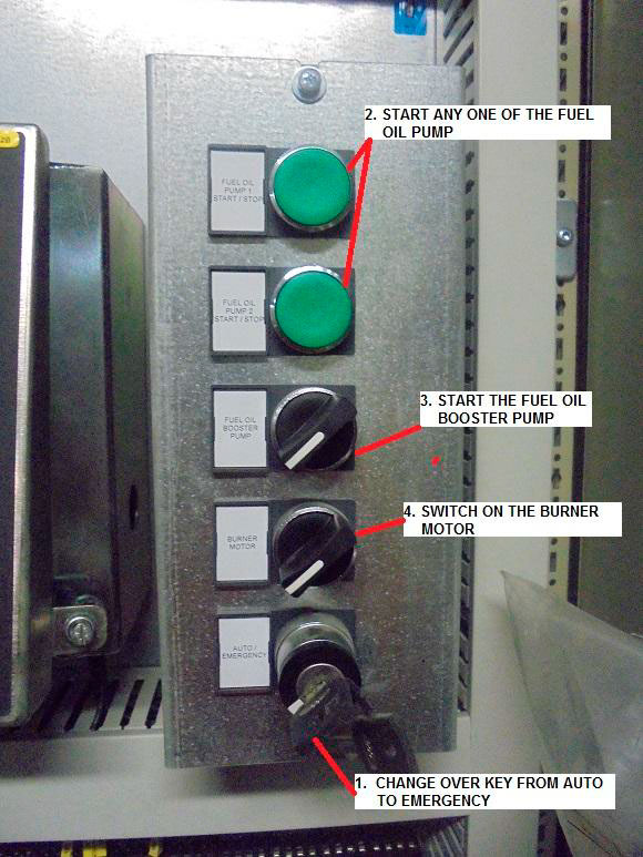 - Start one of the oil pumps from the operating switch located inside the power panel
