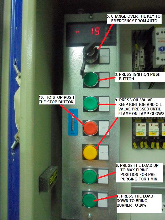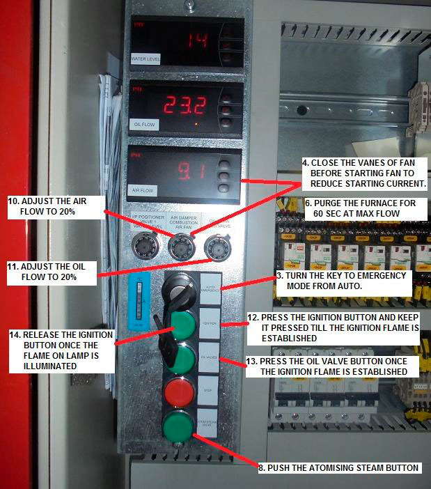 - Set the oil flow to ignition load position to approximately 15-20% load by controlling the oil flow regulating valve