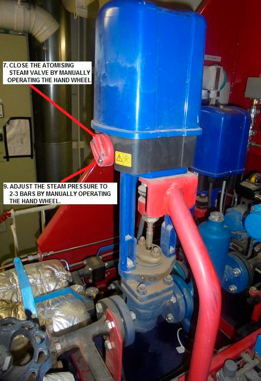 - Adjust the steam-regulating valve for atomizing steam by means of hand wheel or actuator
