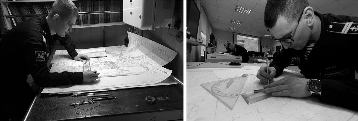 После предварительного знакомства с картой подробно просматривают район, в котором предстоит плавать, чтобы во всех подробностях изучить навигационную обстановку – глубины, опасности и систему их ограждения, береговую черту, расположение маяков и знаков. Для изображения на карте состояния и особенностей поверхности моря его дна и побережья применяется система условных обозначений.
