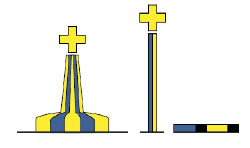 • не будет заменен на знак, ограждающий отдельные опасности. Знаки окрашены в равное количество синих и желтых вертикальных полос. Топовая фигура – крест желтого цвета. Светящий буй имеет переменный сине-желтый проблесковый огонь по схеме: