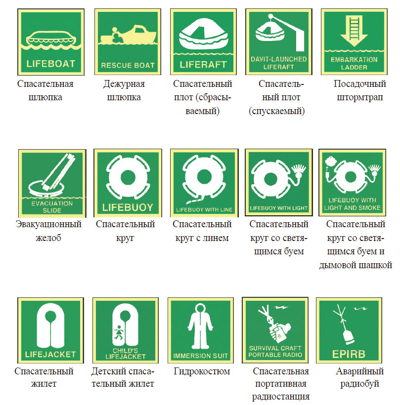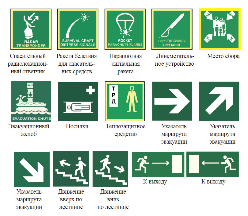 Для указания маршрутов эвакуации по судну размещаются фотолюминесцентные указатели с символами или надписями белого или желтого цвета на зеленом фоне. Указатели обозначают также места расположения спасательных средств, выхода из помещения и т. п.