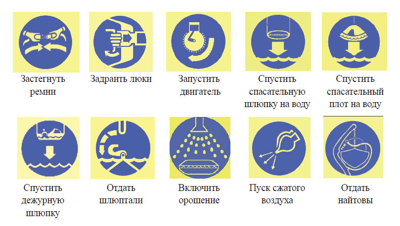 Конвенция СОЛАС-74 предписывает, чтобы либо на коллективных спасательных средствах, либо на пульте управления их спуском или вблизи них были размещены плакаты с нанесенными на них символами, наглядно изображающими действия при посадке в шлюпки или плоты, спуске их на воду и использовании их оборудования.
