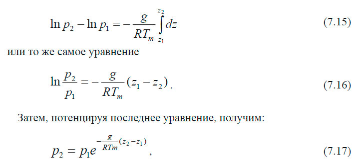 где z1 и z2 — ограниченный слой поверхности атмосферы в виде высоты уровней нижележащего и вышележащего слоёв; Тm — среднее значение температуры воздуха между уровнями z1 и z2.