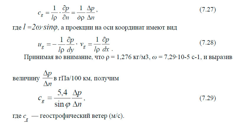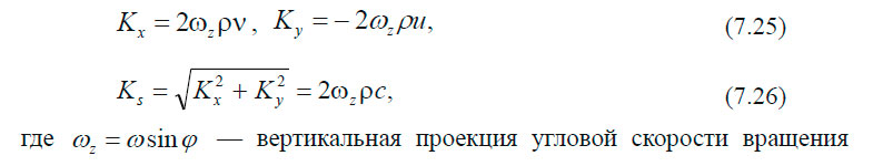 Наибольший интерес представляет горизонтальная составляющая силы Кориолиса — Кs. В выражениях для проекций Кх и Ку, составляющих Кs, можно пренебречь слагаемыми, содержащими вертикальную скорость w, так как она в атмосфере в десятки раз меньше u и v. Тогда можно записать: