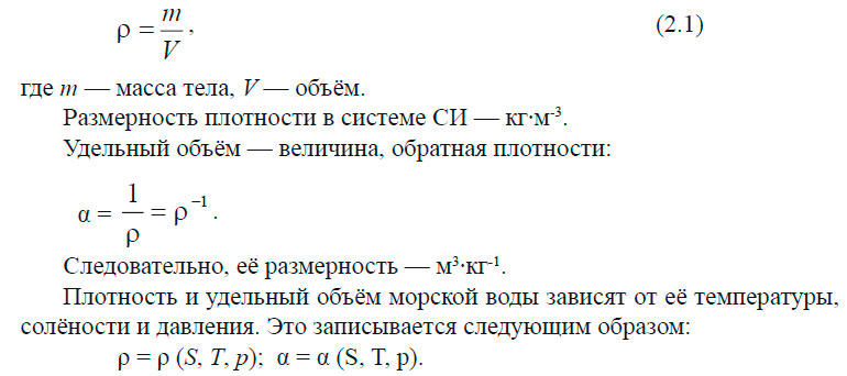 В океанографии параметр состояния «масса» при использовании заменяется параметром «плотность», а объём — удельным объёмом. Физическое понятие плотности — это масса единицы объёма. В случае однородного тела его плотность одинакова по всему объёму и может быть определена по формуле: