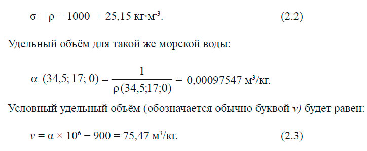 Эта замена не имеет физического смысла и используется только для того, чтобы сократить число знаков при проведении вычислений. Рассмотрим это на примере: средняя плотность морской воды при атмосферном давлении, температуре 17 °С и солёности 34,5 eпc (0/00) равна: ρ (34.5; 17; 0) = 1025,15 кг∙м-3.