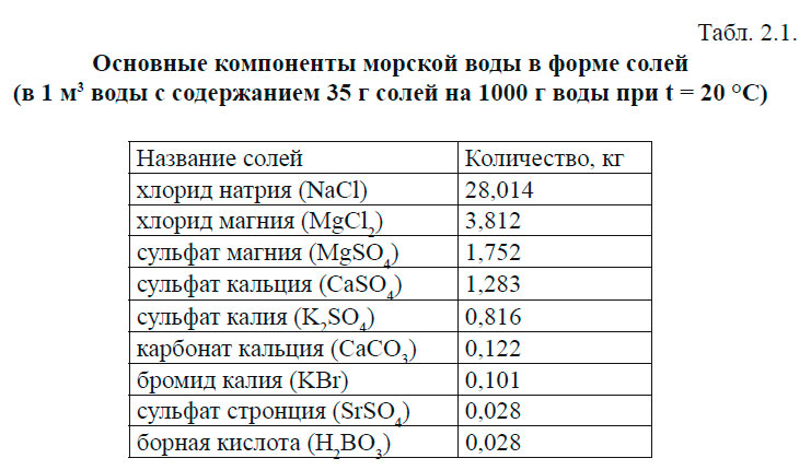 Мировой океан содержит 96,5 % всей воды нашей планеты, и в его воде растворены практически все элементы, встречающиеся на Земле. Их общая масса составляет 48 × 1018 кг. Достаточно подробно солевой состав морской воды был исследован английским химиком Дитмаром, который имел в своем распоряжении 77 проб воды, собранных в различных частях Мирового океана и с различных глубин во время плавания «Челленджера» в 1872–1876 гг. Было установлено, что 99,9 % всех растворённых веществ приходится на первые 20 элементов таблицы Менделеева. Основные компоненты морской воды представлены в табл. 2.1 в форме солей.
