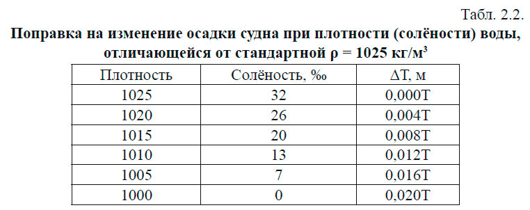 В зависимости от плотности воды изменяется осадка судна. Величина изменения дана в табл. 2.2.