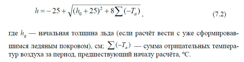 Эта сумма подставляется в формулу со знаком (+) и называется «сумма градусо-дней мороза». Для дальневосточных морей хорошие результаты даёт формула П. А. Трускова: