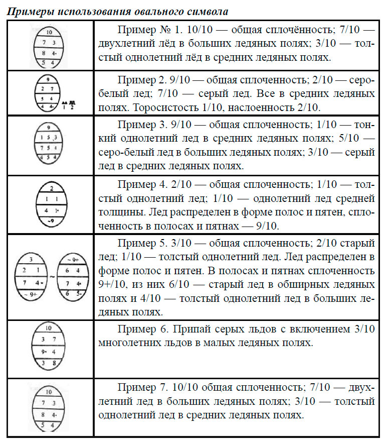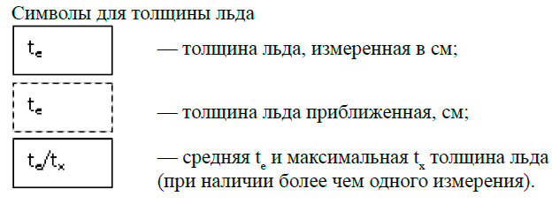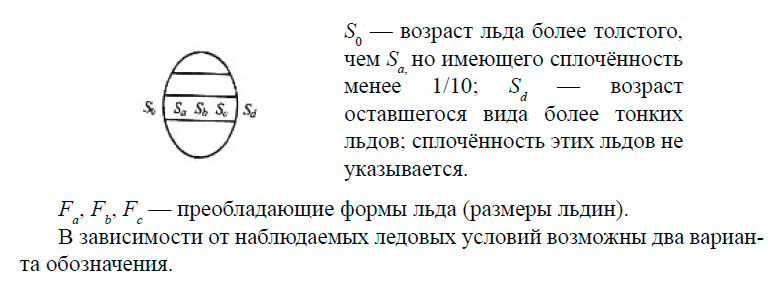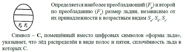 Fa, Fb, Fc — преобладающие формы льда (размеры льдин) для льдов возрастных видов Sa, Sb, Sc соответственно. Если наблюдается много айсбергов(> 1/10) и можно определить их сплочённость, то вместо Sa указывается символ айсберга ▲·, а вместо Fa — символ 9 (табл. 7.11). Если наблюдается только две возрастные стадии льда, то в вместо Fc ставится знак (-), чтобы отличить от второго варианта, когда определяется Fp, Fs.